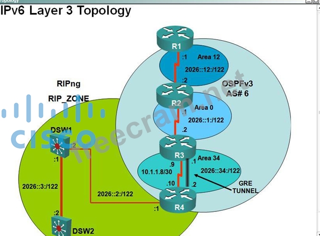 The two IPv6 routing domains, OSPF 6 and RIPng are connected via GRE tunnel running over the underlying IPv4 OSPF domain. Redistrution is enabled where necessary.