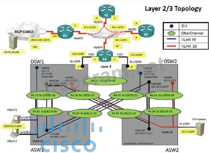 DSW1, DSW2 and R4 are running EIGRP with an AS of 10. Redistribution is enabled where necessary.