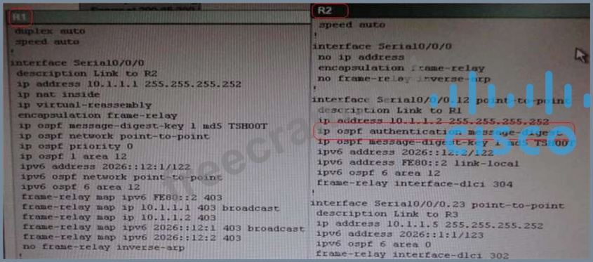 Change required: On R1, for IPV4 authentication of OSPF command is missing and required to configure------ ip ospf authentication message-digest