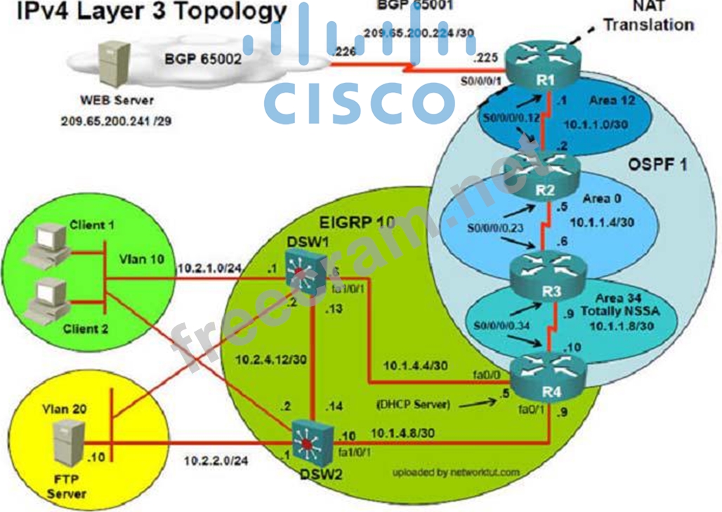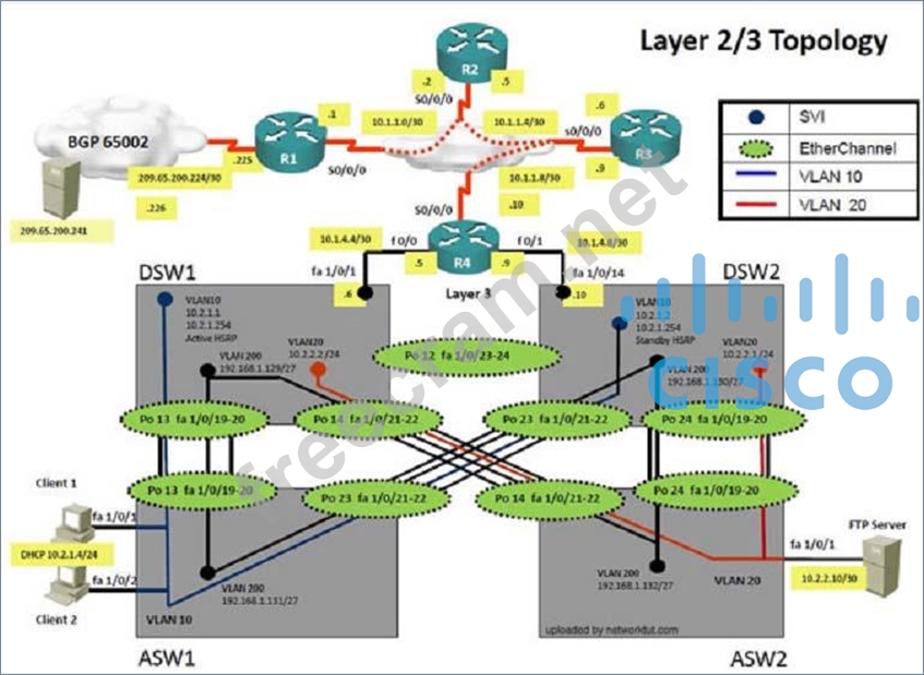 DSW1, DSW2 and R4 are running EIGRP with an AS of 10. Redistribution is enabled where necessary.