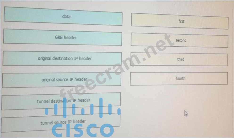 Drag and drop the components of a GRE tunnel from the left into the correct order on the right when monitoring a GRE encapsulated packet.