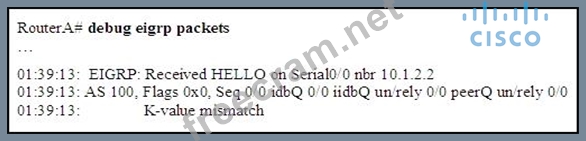 A network administrator is troubleshooting an EIGRP connection between RouterA, IP address 10.1.2.1, and RouterB, IP address 10.1.2.2. Given the debug output on RouterA, which two statements are true? (Choose two.)