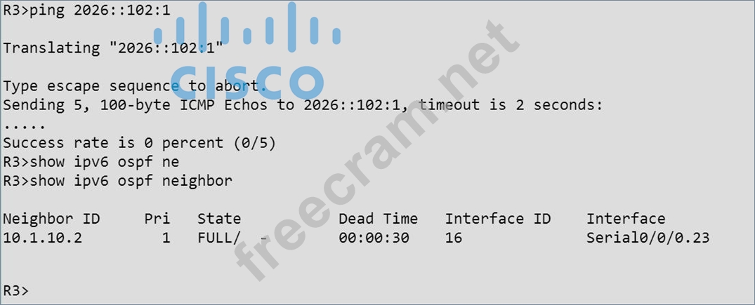 The implementation group has been using the test bed to do an IPv6 'proof-of-concept1. After several changes to the network addressing and routing schemes, a trouble ticket has been opened indicating that the loopback address on R1 (2026::111:1) is not able to ping the loopback address on DSW2 (2026::102:1).