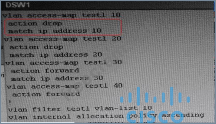*Change required: On DSW1, VALN ACL, Need to delete the VLAN access-map test1 whose action is to drop access-list 10; specifically 10.2.1.3
