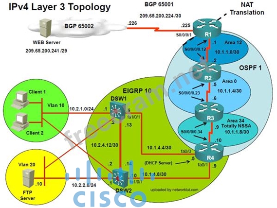 DSW1, DSW2 and R4 are running EIGRP with an AS of 10. Redistribution is enabled where necessary.