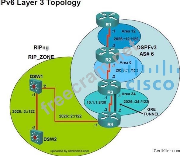 Problem: Loopback address on R1 (2026::111:1) is not able to ping the loopback address on DSW2 (2026::102:1). Configuration of R4: ipv6 router ospf 6 log-adjacency-changes ! ipv6 router rip RIP_ZONE redistribute ospf 6 metric 2 include-connected ! The Fault Condition is related to which technology?