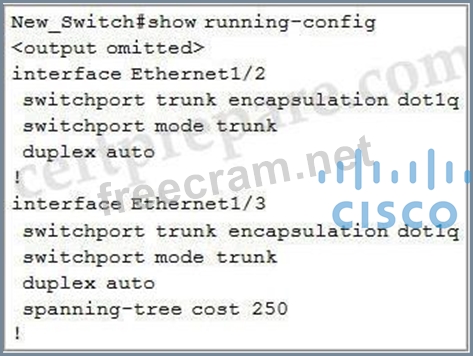 You have configured PVST+ load balancing between SW1 and the New_Switch in such a way that both the links E2/2 and E2/3 are utilized for traffic flow, which component of the configuration is preventing PVST+ load balancing between SW1 and SW2 links?