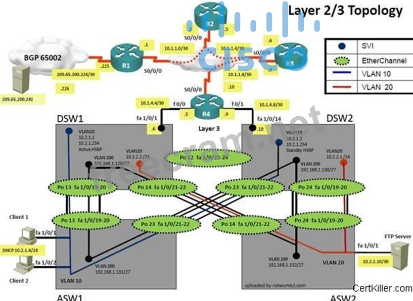 Scenario: The implementation group has been using the test bed to do a 'proof-of-concept' that requires both Client 1 and Client 2 to access the WEB Server at 209.65.200.241. After several changes to the network addressing, routing schemes, DHCP services, layer 2 connectivity, FHRP services, and, device security, a trouble ticket has been opened indicating that Client 1 cannot ping the 209.65.200.241 address.