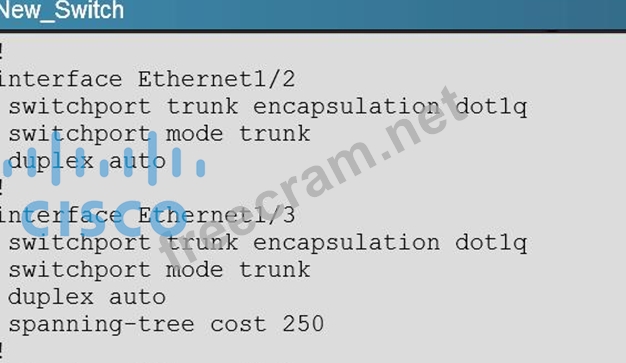 You have configured PVST+ load balancing between SW1 and the New_Switch in such a way that both the links E2/2 and E2/3 are utilized for traffic flow, which component of the configuration is preventing PVST+ load balancing between SW1 and SW2 links