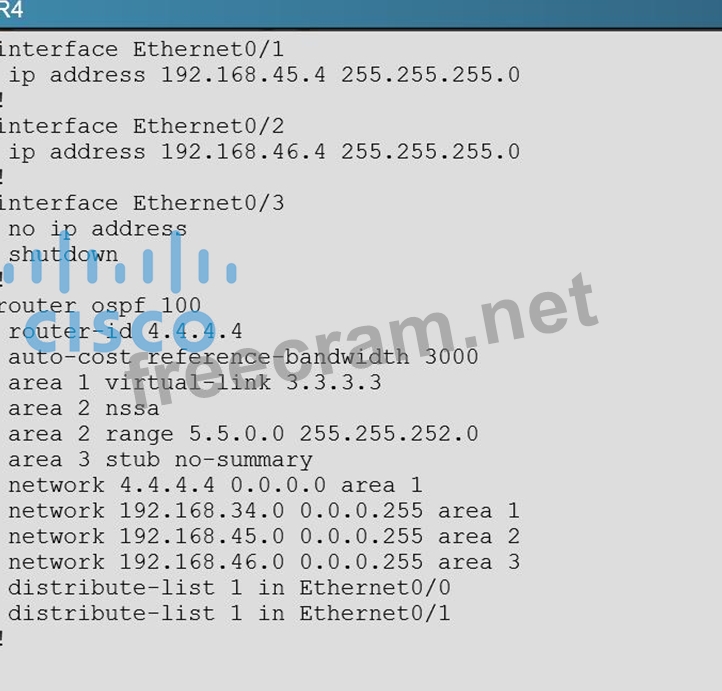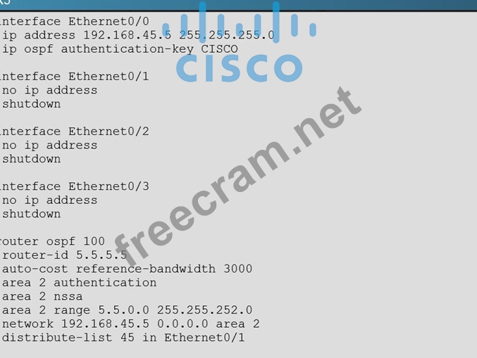 Here, we see from the running configuration of R5 that OSPF authentication has been configured on the link to R4: However, this has not been done on the link to R5 on R4: