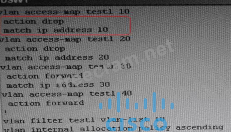 On DSW1, VALN ACL, Need to delete the VLAN access-map test1 whose action is to drop access-list 10; specifically 10.2.1.3