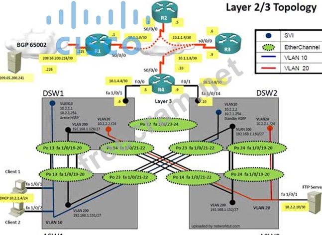 DSW1, DSW2 and R4 are running EIGRP with an AS of 10. Redistribution is enabled where necessary.