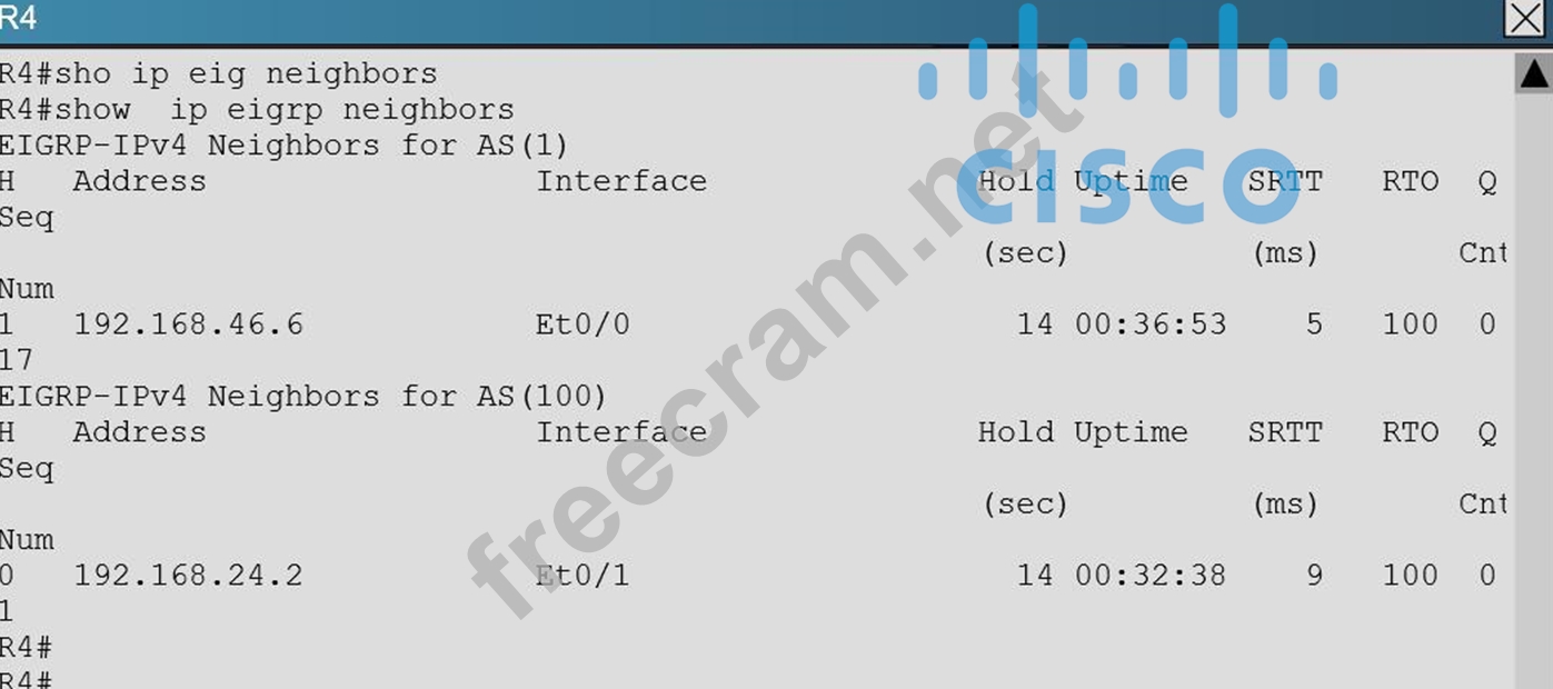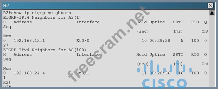 Explanation When issuing the "show ip eigrp neighbor" command (which is about the only command that it lets you do in this question) you will see that all other routers are configured for EIGRP AS 1. However, the 192.16824.0 network between R2 and R4 is incorrectly configured for EIGRP AS 100: