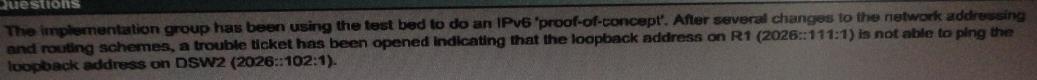 * Since the problem is R1 (2026::111:1) is not able to ping loopback of DSW1 (2026::102:1).
