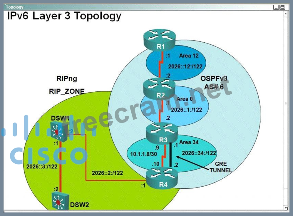 The two IPv6 routing domains, OSPF 6 and RIPng are connected via GRE tunnel running over the underlying IPv4 OSPF domain. Redistrution is enabled where necessary.