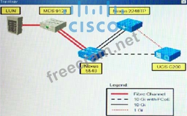 Customer is deploying Cisco Nexus 5548 switch with FCoE in their new data center, as shown in the topology diagram. Click Nexus5548 icon to run show commands and answer the questions.