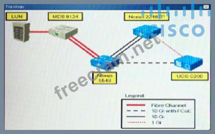 Customer is deploying Cisco Nexus 5548 switch with FCoE in their new data center, as shown in the topology diagram. Click Nexus5548 icon to run show commands and answer the questions.