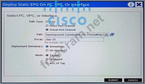 You perform the configuration as shown in the exhibit. Which two additional tasks must you perform to deploy EPG on PC, VPC, or Interface? (Choose two.)