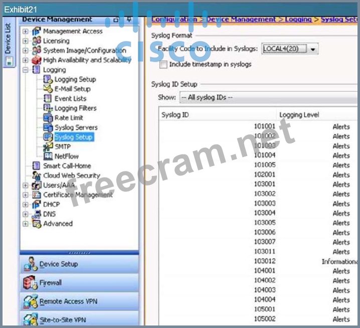 Question 30: At which firewall severity level will debugs appear on a Cis...