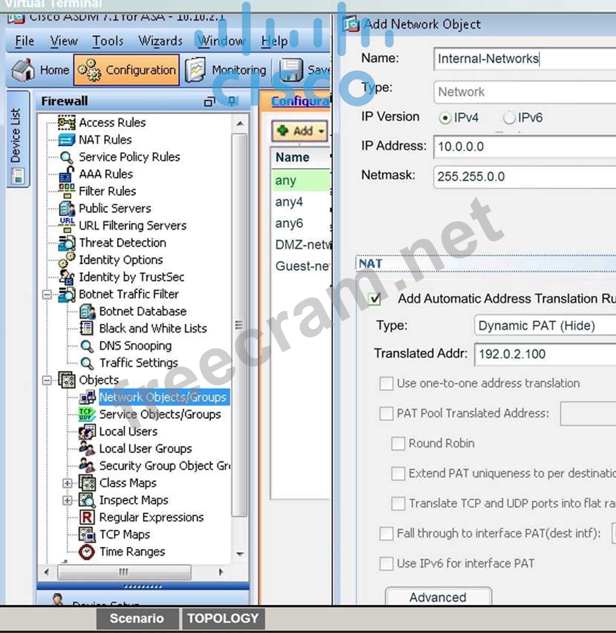 Use the Cisco ASDM GUI on the Admin PC to configure dynamic network object NAT with PAT using