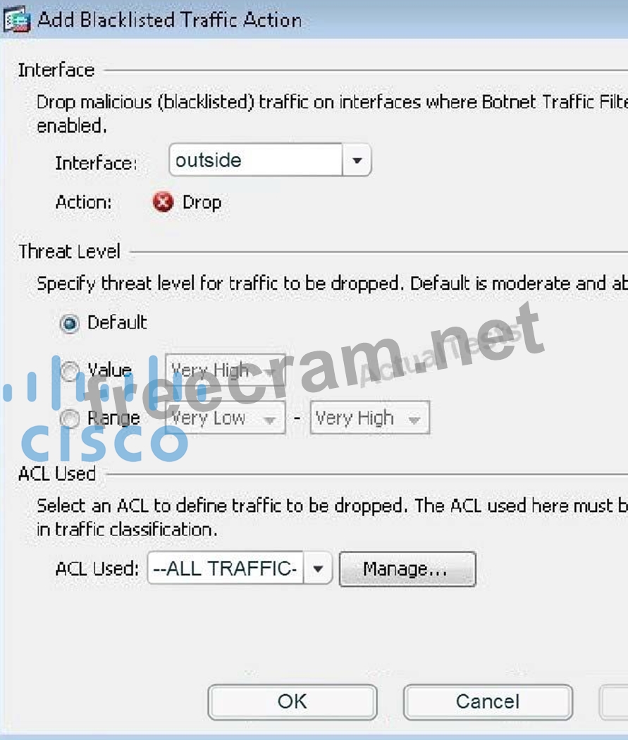 Configure the Botnet Traffic Filter to drop blacklisted traffic on the outside interface. Use the default Threat Level settings