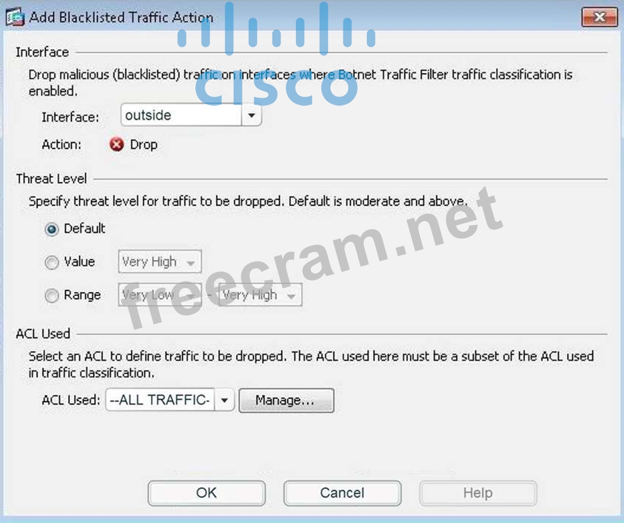 Configure the Botnet Traffic Filter to drop blacklisted traffic on the outside interface. Use the default