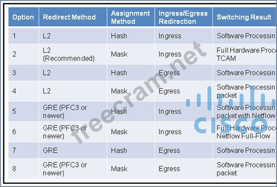 When designing the network to redirect web traffic utilizing the Catalyst 6500 to the Cisco Web Security Appliance, impact on the switch platform needs consideration. Which four rows identify the switch behavior in correlation to the redirect method? (Choose four.)