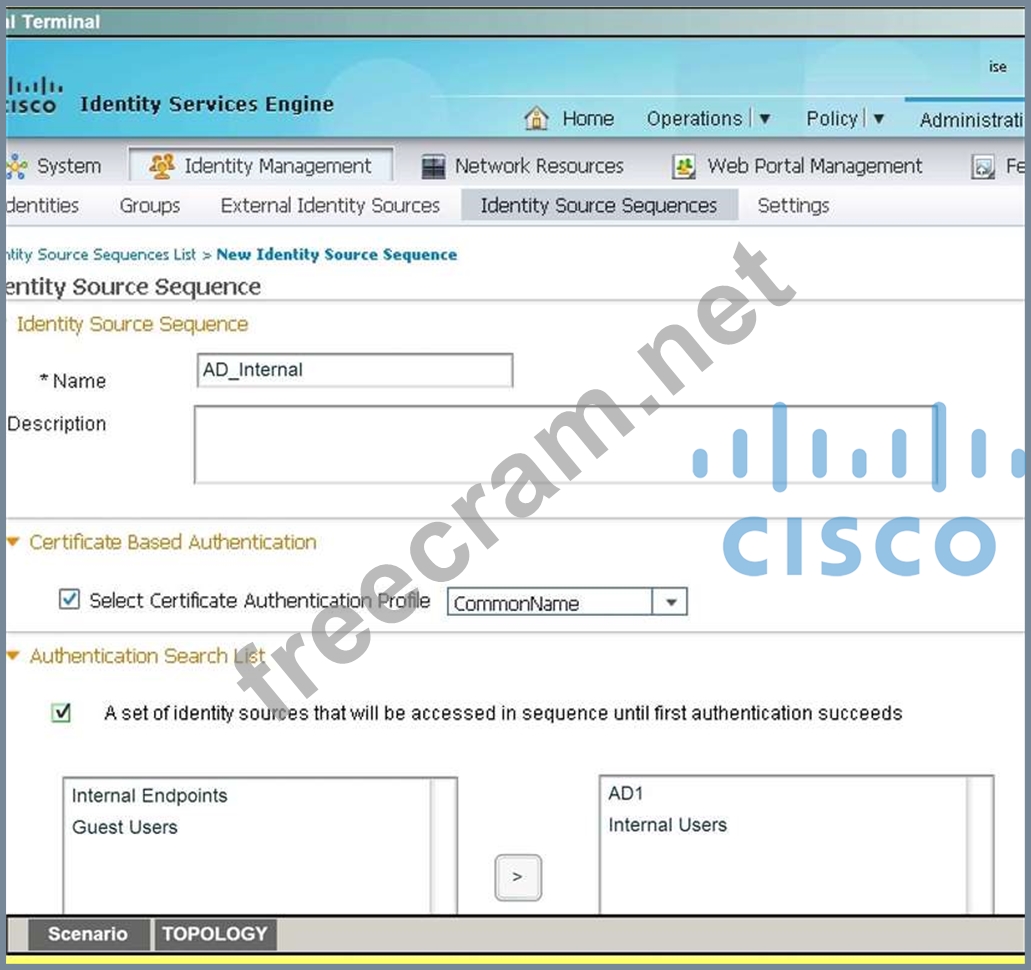 * Create a new identity source sequence named AD_internal to first use the Microsoft Active Directory (AD1) then use the ISE Internal User database