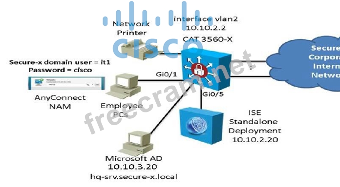 The Secure-X company has started to tested the 802.1X authentication deployment using the Cisco Catalyst 3560-X layer 3 switch and the Cisco ISEvl2 appliance. Each employee desktop will be connected to the 802.1X enabled switch port and will use the Cisco AnyConnect NAM 802.1X supplicant to log in and connect to the network.