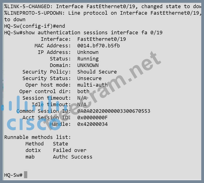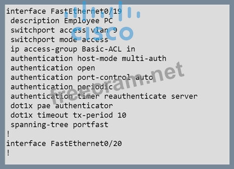 * Use the required show command to verify the MAC address authentication on the Fa0/19 is successful The switch enable password is Cisco For the purpose of the simulation, to test the network printer, assume the network printer will be unplugged then plugged back into the Fa0/19 switch port after you have finished the required configurations on the Fa0/19 switch port.