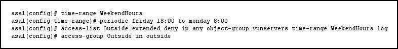 If the given configuration is applied to the object-group vpnservers, during which time period are external users able to connect?
