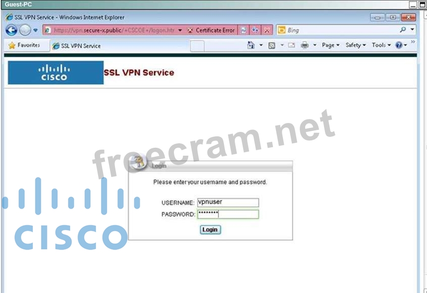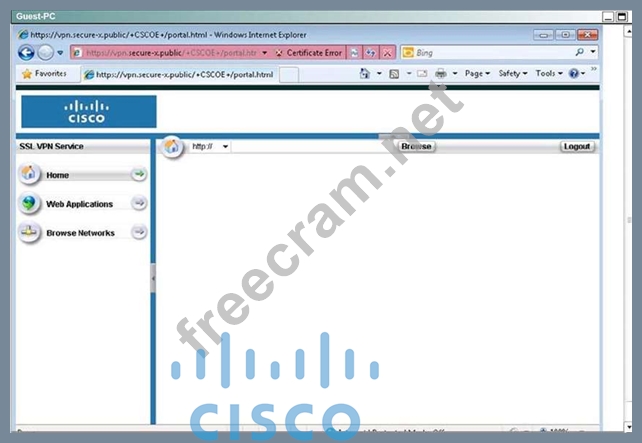 * Using the Guest PC, open an Internet Explorer window and test and verify the basic connection to the SSL VPN portal using address: https://vpn-secure-x.public