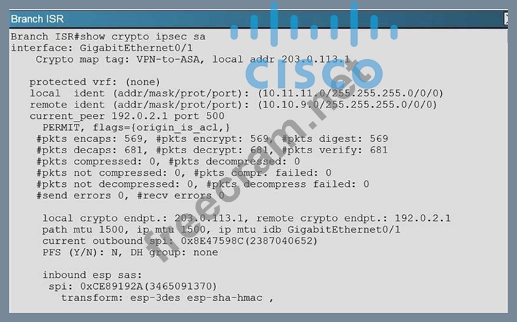 You are now tasked with verifying the IKEvl IPsec installation to ensure it was properly configured according to designated parameters. Using the CLI on both the Cisco ASA and branch ISR, verify the IPsec configuration is properly configured between the two sites.