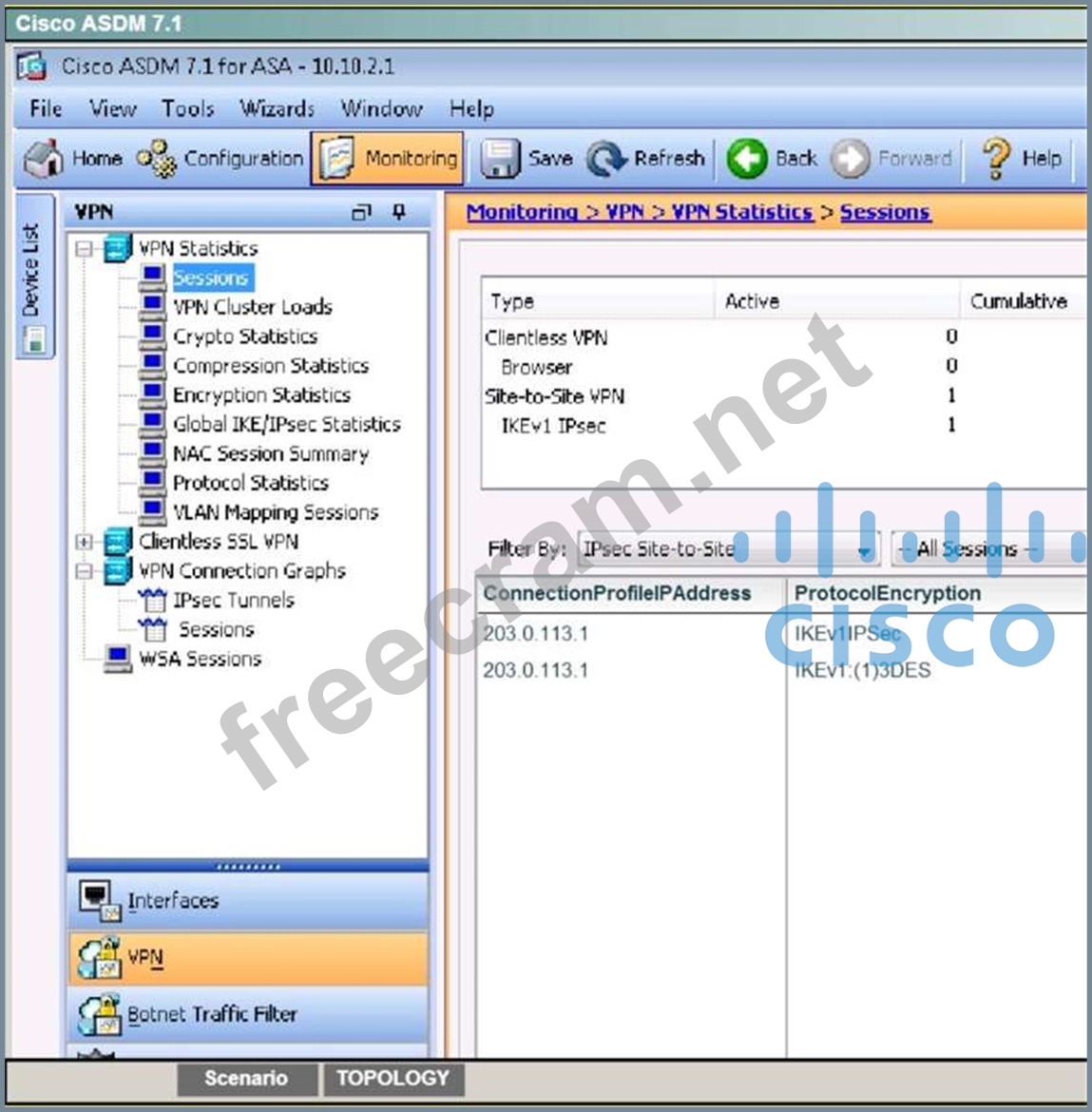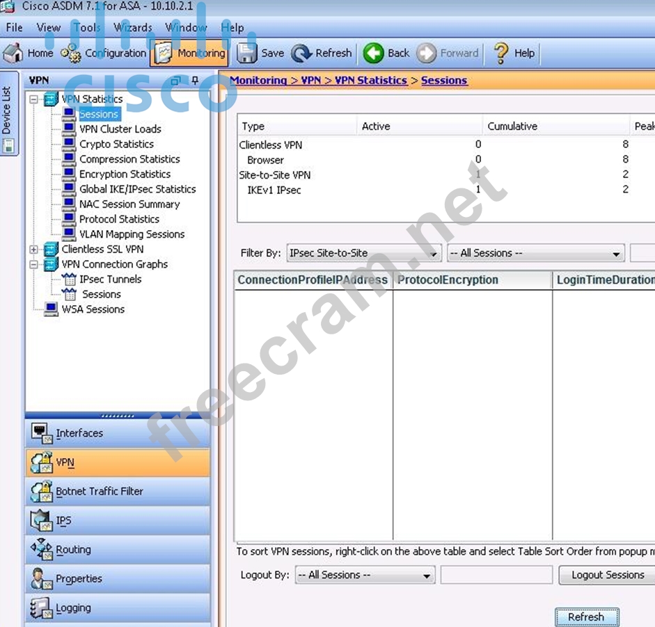 Verify tunnel establishment in ASDM VPN Statistics> Sessions window pane