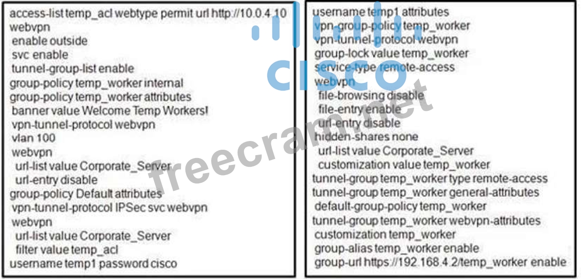10.0.4.10. After the junior network engineer finished the configuration, an IT security specialist tested the account of the temporary worker. The tester was able to access the URLs of additional secure servers from the WebVPN user account of the temporary worker.