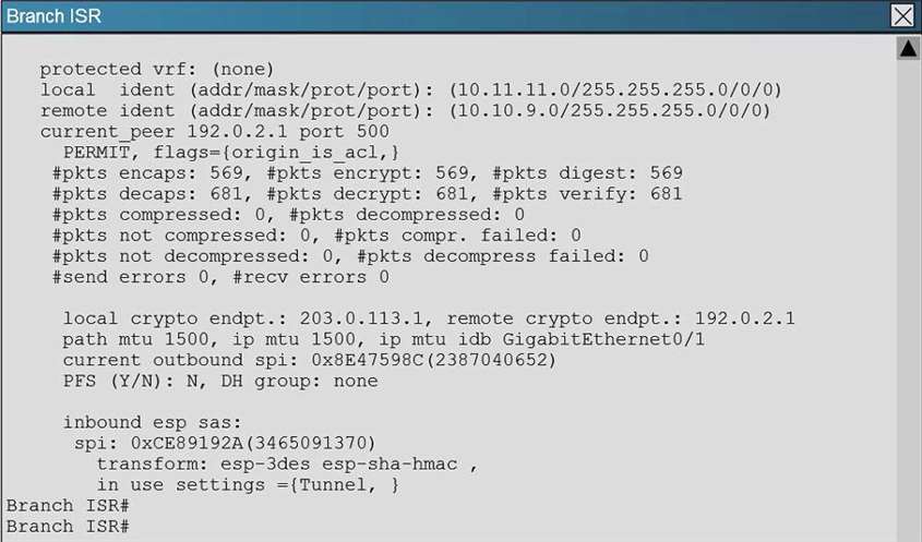 You are now tasked with verifying the IKEvl IPsec installation to ensure it was properly configured according to designated parameters. Using the CLI on both the Cisco ASA and branch ISR, verify the IPsec configuration is properly configured between the two sites.