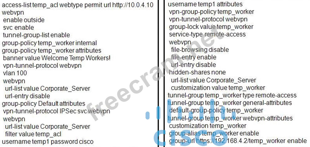 A junior network engineer configured the corporate Cisco ASA appliance to accommodate a new temporary worker. For security reasons, the IT department wants to restrict the internal network access of the new temporary worker to the corporate server, with an IP address of 10.0.4.10. After the junior network engineer finished the configuration, an IT security specialist tested the account of the temporary worker. The tester was able to access the URLs of additional secure servers from the WebVPN user account of the temporary worker.