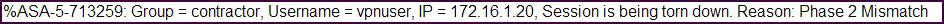 Explanation http://www.cisco.com/en/US/tech/tk583/tk372/technologies_tech_note09186a00800949c5.shtmland %ASA-5-713259: Group = groupname, Username = username, IP = peerIP, Session is being torn down. Reason: reason Explanation The termination reason for the ISAKMP session appears, which occurs when the session is torn down through session management. *groupname-The tunnel group of the session being terminated *username-The username of the session being terminated *peerIP-The peer address of the session being terminated *reason-The RADIUS termination reason of the session being terminated. Reasons include the following: - Port Preempted (simultaneous logins) - Idle Timeout - Max Time Exceeded - Administrator Reset