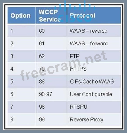 Refer to the exhibit. Which four rows exhibit the correct WCCP service to protocol assignments? (Choose four.)