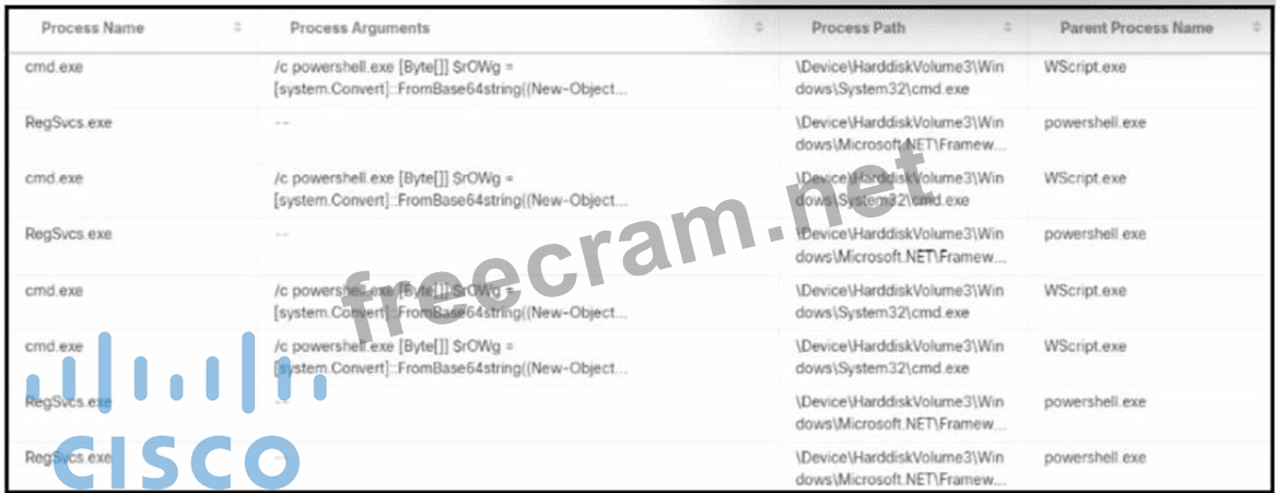 The exhibit shows a series of process executions that form a suspicious chain involving scripting engines and obfuscated commands: * One critical indicator iscmd.exe executing PowerShell with obfuscated (Base64-encoded) arguments . The use of Base64 is a known method used by attackers to mask malicious commands. This aligns with attack techniques defined under MITRE ATT&CK T1059 (Command and Scripting Interpreter) and T1086 (PowerShell abuse). Therefore, option D is valid. * Another important IOC isWScript.exe acting as a parent of cmd.exe, which is abnormal in typical business environments. This indicates potential misuse of Windows Script Host (WSH) to launch commands, often seen in phishing or malware dropper scenarios. Thus, option E is also valid. Options A and B by themselves are not definitive IOCs-PowerShell and cmd.exe are legitimate administrative tools and frequently used in Windows environments. Option C is not supported by the exhibit-the reverse (powershell.exe initiated by WScript.exe) is what's seen, not the other way around. These patterns align with theCyberOps Technologies (CBRFIR) 300-215 study guide, which specifies that chaining of interpreters (e.g., WScript # cmd # PowerShell) with encoded commands is a key indicator of compromise during forensic analysis. Reference:CyberOps Technologies (CBRFIR) 300-215 study guide, Chapter on Identifying Malicious Activity in Host-Based Artifacts and Command-Line Analysis.