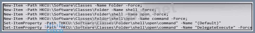 The exhibit shows a PowerShell script that modifies registry keys under: * HKCU:\Software\Classes\Folder\shell\open\command This technique is commonly associated with aUAC (User Account Control) bypass. Specifically: * It creates a new custom shell command path for opening folders. * The key registry property"DelegateExecute"is set, which is a known bypass method. If set without a value, it may cause Windows to run commands with elevated privileges without showing the UAC prompt. The use ofHKCU(HKEY_CURRENT_USER) rather thanHKLM(HKEY_LOCAL_MACHINE) allows the attacker to bypass permissions since HKCU is writable by the current user. This registry hijack can be leveraged by a malicious actor to execute arbitrary commands with elevated rights. This is identified in the Cisco CyberOps study material under "UAC bypass techniques," which describes: "Attackers often create or modify registry keys like DelegateExecute to hijack the default behavior of applications and elevate privileges". Thus, option B is correct: the exhibit demonstrates a UAC bypass using user-accessible registry modification.