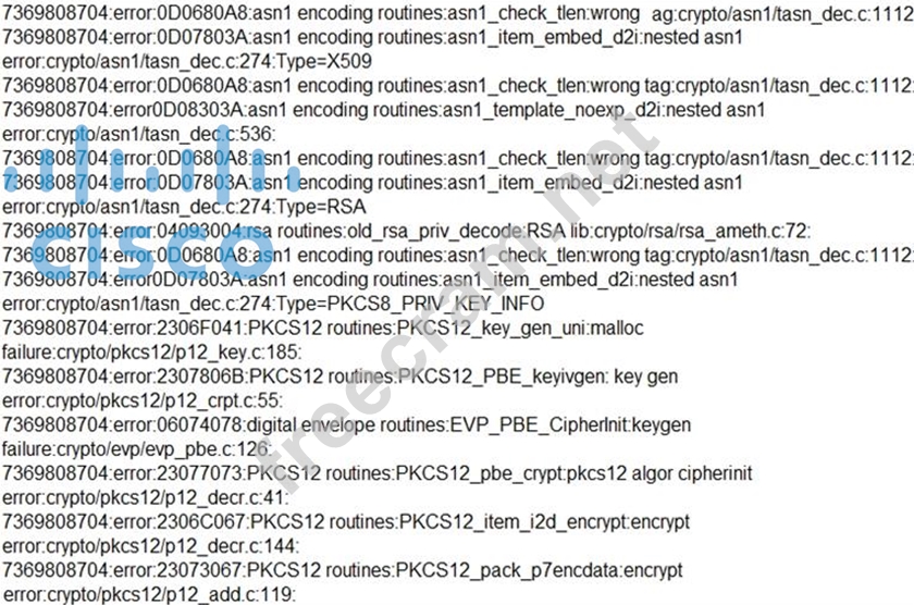The error logs indicate multiplePKCS12andASN.1 decodingerrors, such as: * PKCS12 routines:PKCS12_parse:mac verify failure * rsa routines:old_rsa_priv_decode:RSA lib * PKCS12 routines:PKCS12_key_gen_uni:malloc These specific errors most commonly occur when: * Theprivate key does not correspondto the certificate being used. * There is amismatchbetween the public and private key pair required for SSL handshakes. This is a well-documented condition in Apache SSL configuration issues and explicitly covered under TLS /SSL troubleshooting sections in cybersecurity operations contexts. The Cisco CyberOps guide also notes that SSL errors with key verification usually result from "improper key/certificate pairing" rather than file corruption or missing modules. Thus, the correct answer is: B). The private key does not match with the SSL certificate.