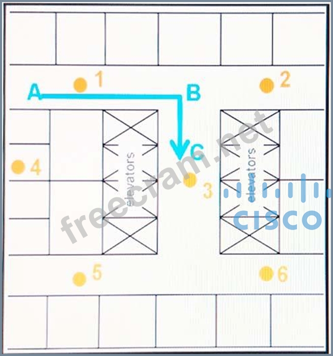 Access points are deployed in an office building and users report that the real-time communications quality of experience is poor when users walk between the elevators. The elevators are a heavy metallic obstacle, and AP 3 was installed to cover the elevator area, which AP 1 and AP 2 signal does not reach.