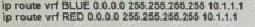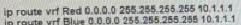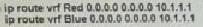 An engineer creates a default static route on a router with a hop of 10.1.1.1. On inspection, the engineer finds the router has two VRFs, Red and Blue. The next hop is valid for both VRFs and exists in each assigned VRF.