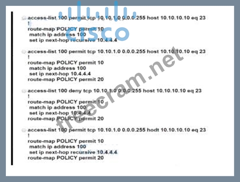 10.10.10.10 from 10.10.1.0/24 via a next hop of 10.4.4.4. which is directly connected to the router that is connected to the 10.1.1.0/24 subnet Which configuration reroutes traffic according to this requirement?
