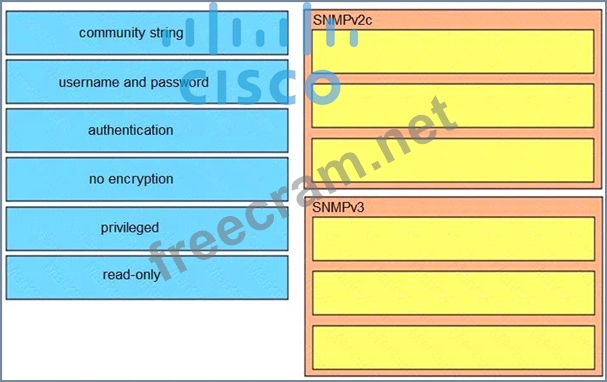 Drag and drop the SNMP attributes in Cisco IOS devices from the left onto the correct SNMPv2c or SNMPV3 categories on the right.