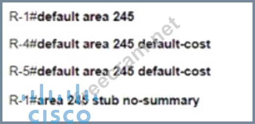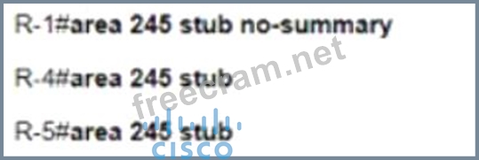 Refer to the exhibit A network administrator is troubleshooting to reduce the routing table of R4 and R5 to learn only the default route to communicate from Inter-Area and Intra-Area networks Which configuration resolves the issue?