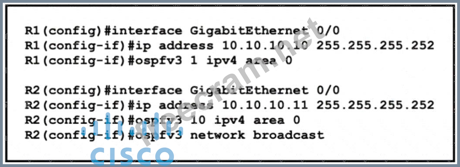 Refer to the exhibit An engineer is troubleshooting an OSPF adjacency issue between directly connected routers R1 and R2 Which configuration resolves the issue?