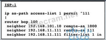 Refer to the exhibit. AS 111 mut not be used as a transit AS, but ISP-1 is getting ISP-2 routes from AS 111.