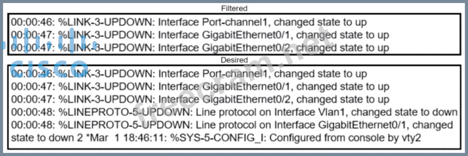 Refer to the exhibits. An engineer filtered messages based on severity to minimize log messages. After applying the filter, the engineer noticed that it filtered required messages as well. Which action must the engineer take to resolve the issue?